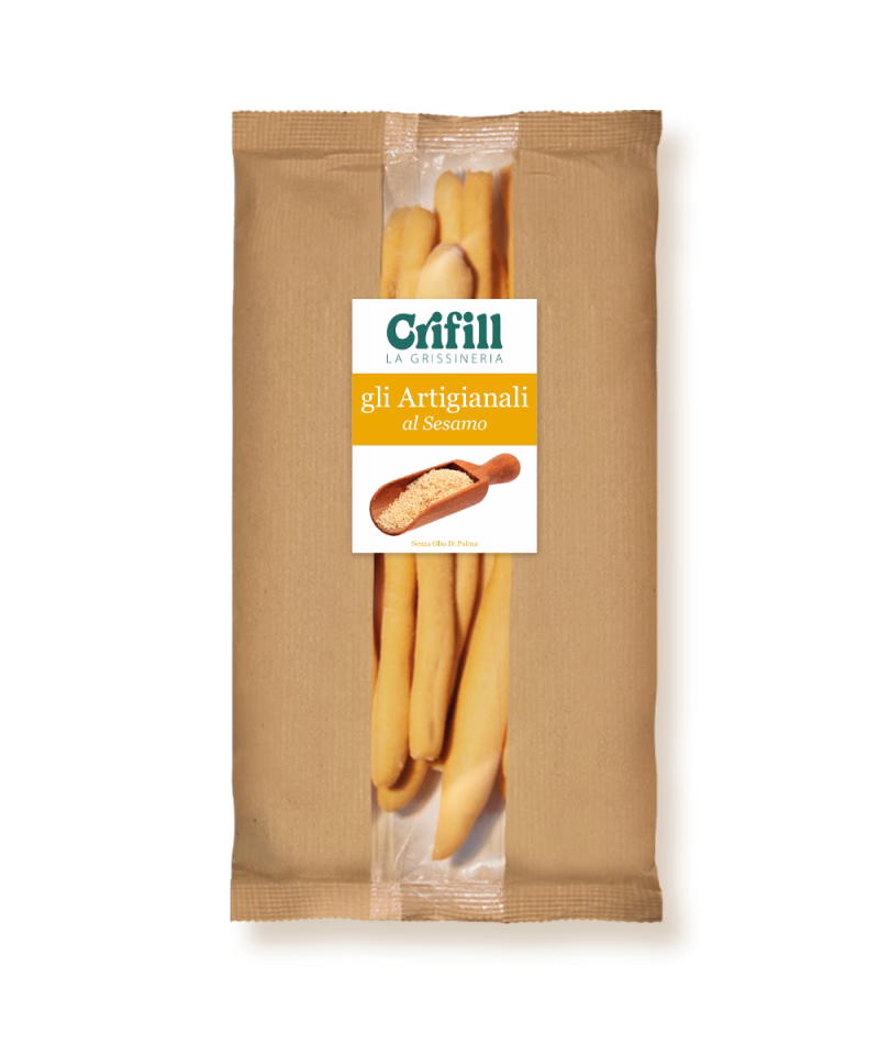 Ingredienti: farina di frumento tipo 0, acqua, farina di grano duro, semi di sesamo, grassi e oli vegetali (olio di cocco, olio di girasole, acqua), olio di oliva, sale, lievito.